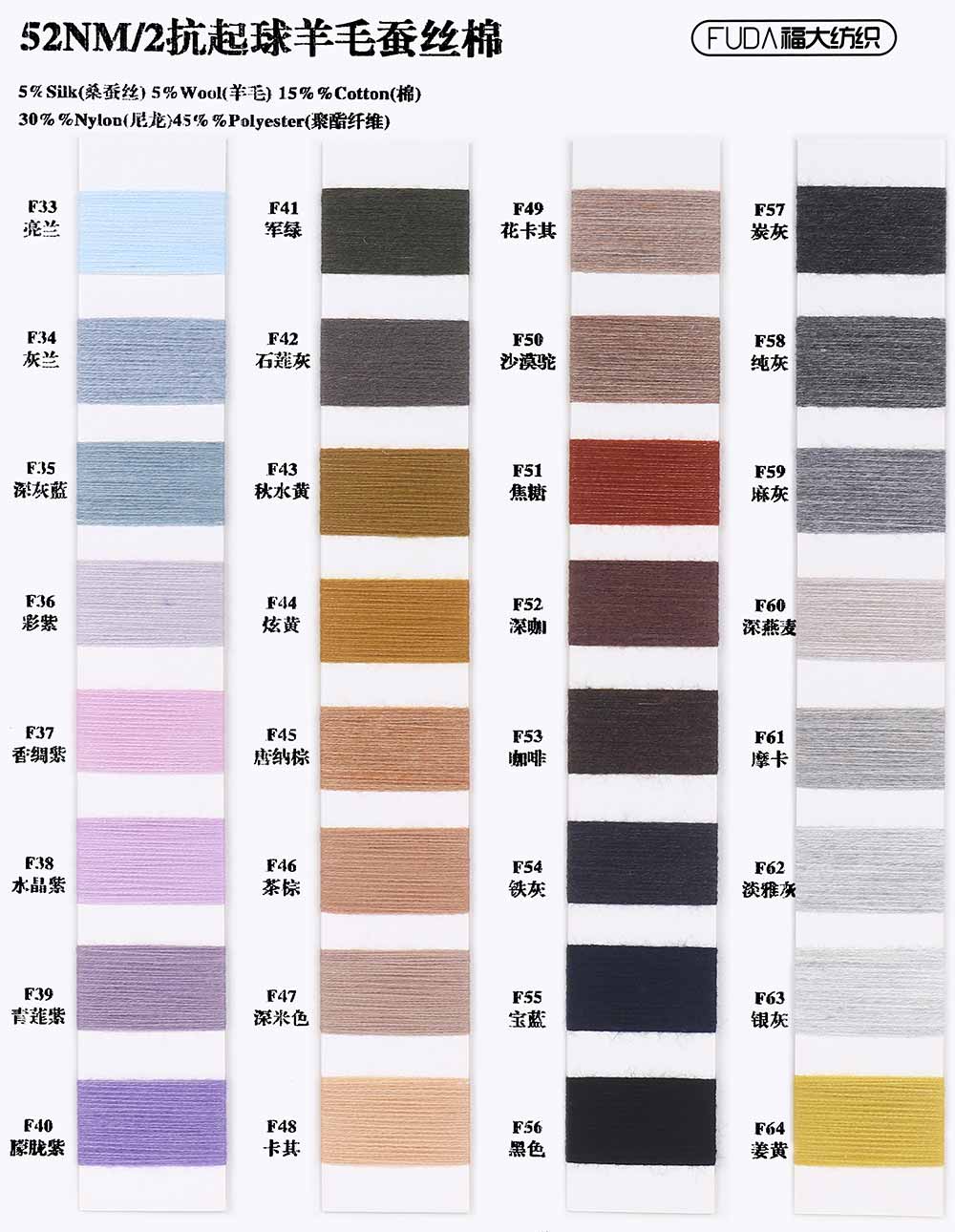 5%桑蚕丝Silk 5%羊毛Wool 15%棉Cotton 30%尼龙Nylon 45%涤纶Polyester
