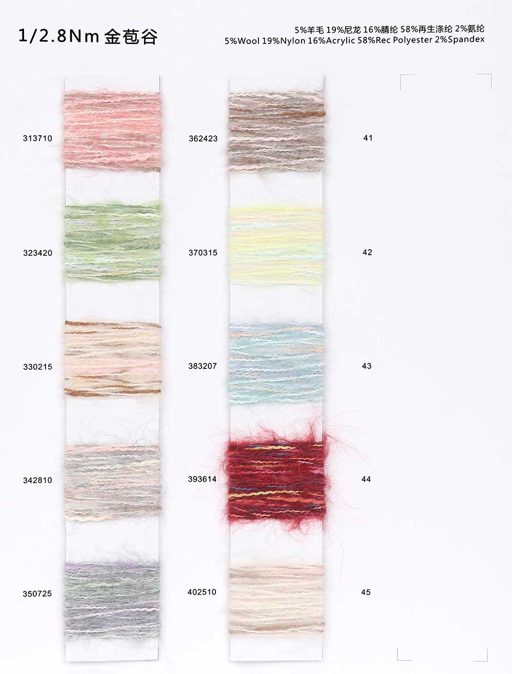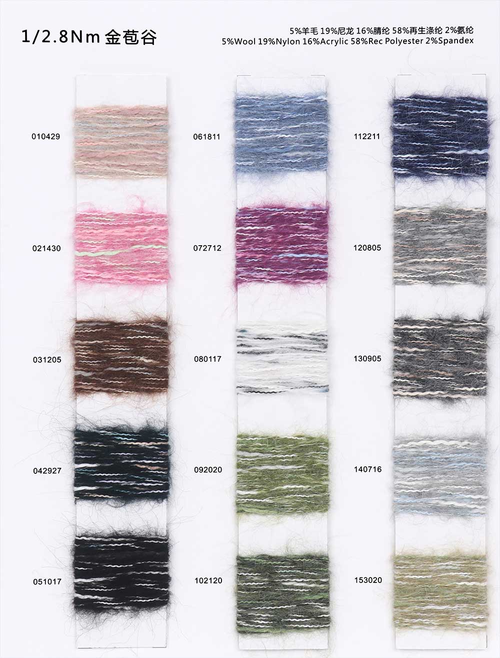 15%羊毛Wool 27%涤纶Polyester 36%腈纶Acrylic 20%尼龙Nylon 2%氨纶Spandex